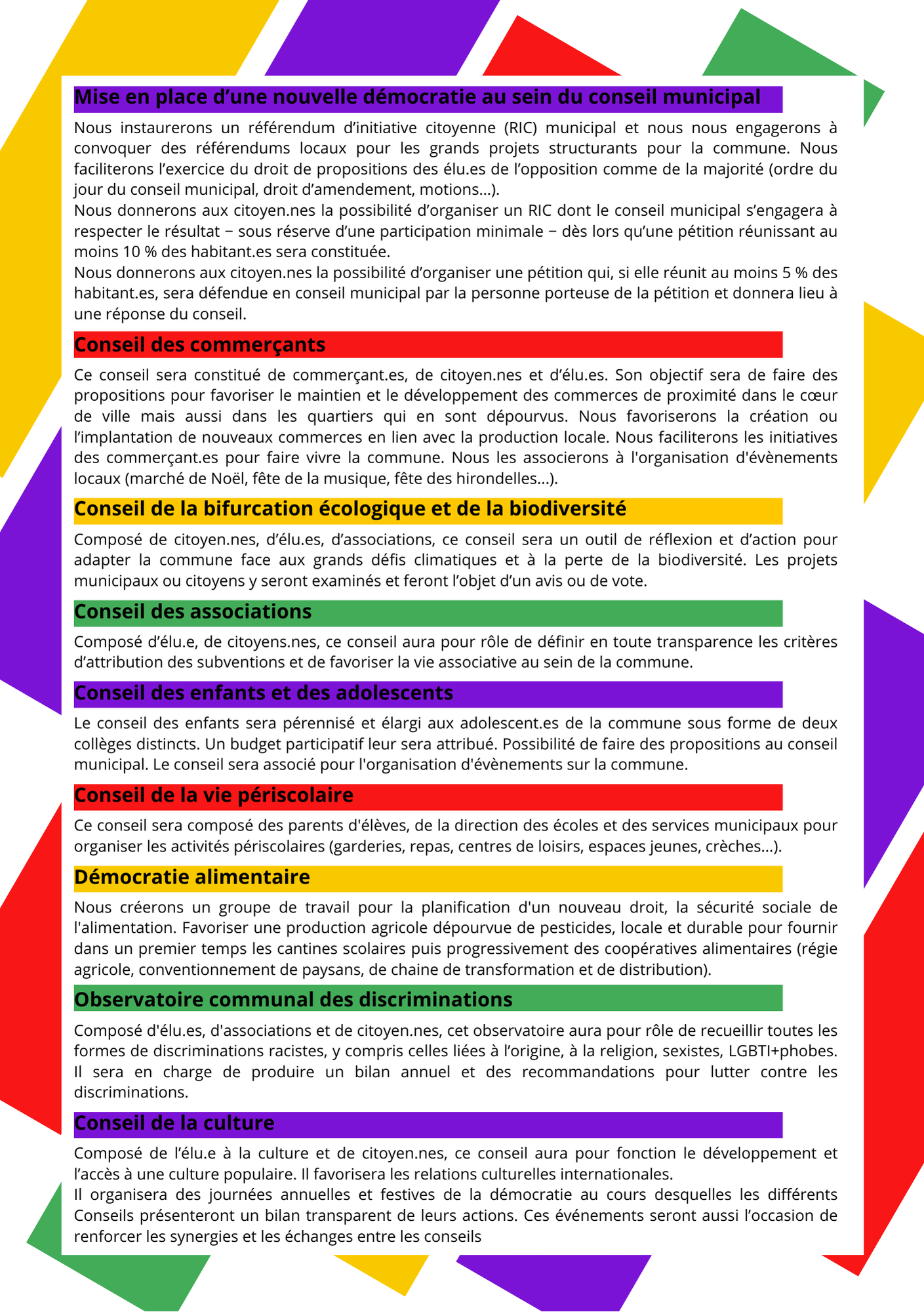 6. Partager le pouvoir de décision du conseil municipal avec les Pradéen·nes par la création de conseils. Conseil des commerçants, conseil de la bifurcation écologique, conseil des associations, conseils des enfants et des adolescents et conseil de la culture permettront à ceux qui le souhaitent de s'impliquer et de participer aux décisions. Des journées annuelles et festives de la Démocratie seront organisées au cours desquelles les différents conseils présenteront un bilan transparents de leurs actions. Ces journées seront aussi l'opportunité de renforcer les échanges et les liens entre les conseils.