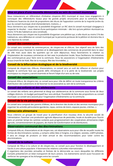 A l’échelle locale, créer un canal de communication et d’échanges réguliers entre municipalité et administré·es et améliorer le fonctionnement des consultations publiques. Instaurer un référendum d’initiative citoyenne (RIC) municipal et s’engager à convoquer des référendums locaux pour les grands projets structurants pour la commune. Faciliter l’exercice du droit de propositions des élu·es de l’opposition comme de la majorité (ordre du jour du conseil municipal, droit d’amendement, motions, etc.).